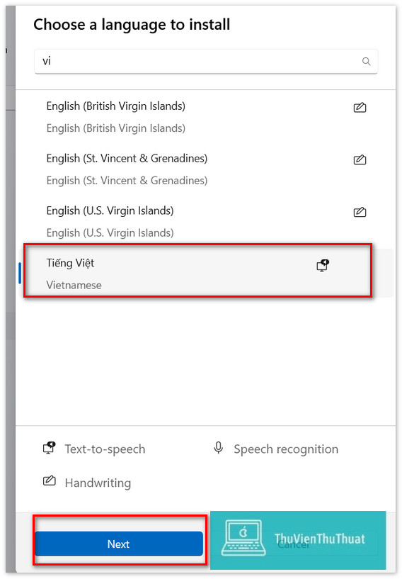 Bước 4: Tìm và thêm ngôn ngữ Tiếng Việt, nhấn Next để tiếp tục.