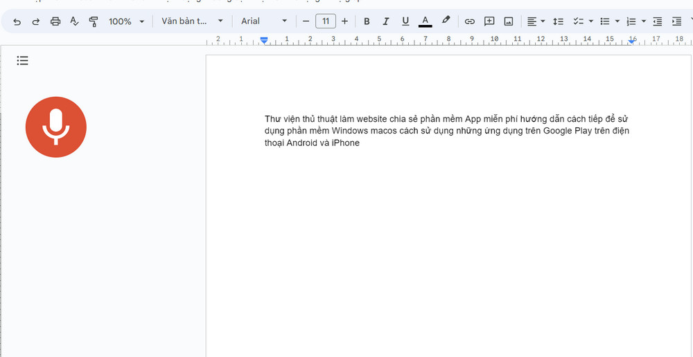 Bước 4: Khi biểu tượng micro chuyển từ xám sang đỏ, bạn có thể bắt đầu đọc văn bản bằng tiếng Việt. Google Docs sẽ tự động chuyển nội dung và hiển thị thành văn bản tương ứng. Để tạp dừng ghi âm giọng nói trên word, ban bấm nút micro màu cam để tắt nha.