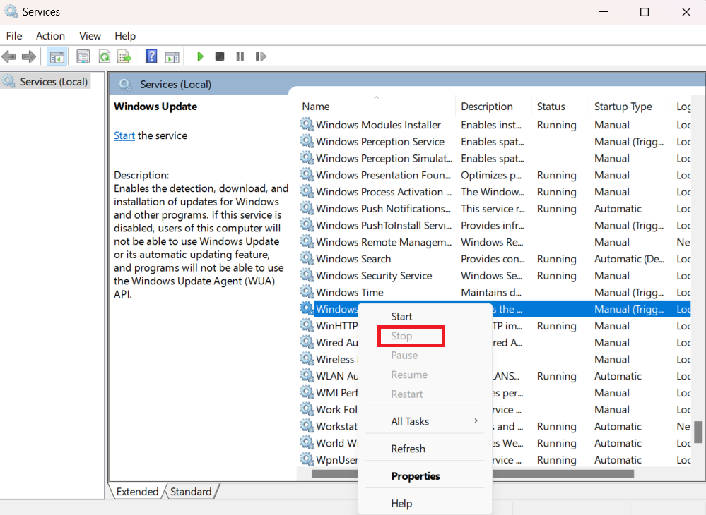 Bước 2: Trong cửa sổ ứng dụng Services hiển thị, trong khung bên phải di chuyển xuống phía dưới tìm và kích chuột phải vào dịch vụ Windows Update. Từ menu hiển thị, chọn tùy chọn Stop để dừng dịch vụ Windows Update.