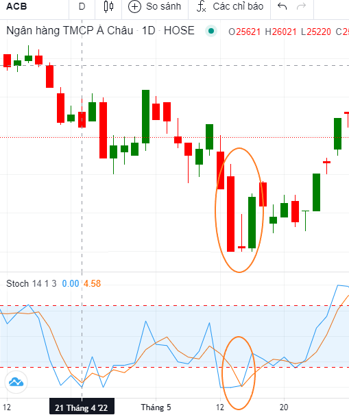 - Nếu Stochastic nằm dưới vùng 20, hành động giá đang trong trạng thái quá bán.
