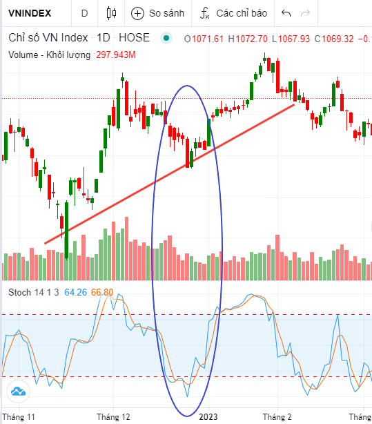 Dựa vào tín hiệu phân kỳ giữa đường %D và đường giá, NĐT có thể xác định các điểm đảo chiều tiềm năng.