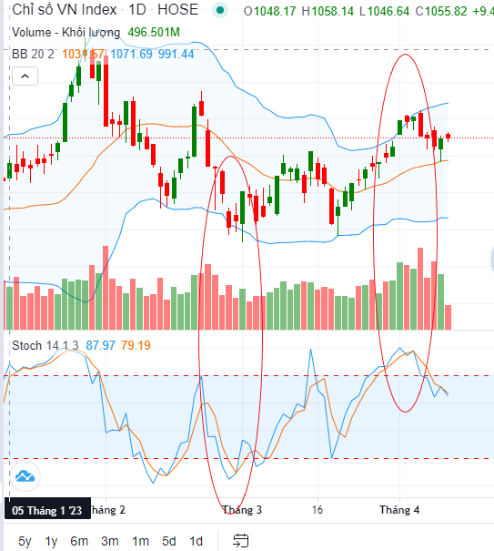 - Nếu Stochastic nằm trên vùng 80, thị trường đang trong trạng thái quá mua.