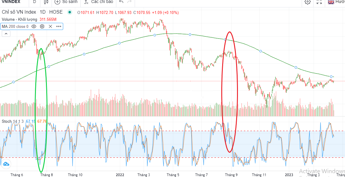 Tín hiệu bán: Nếu giá nằm trên đường MA200, kết hợp chỉ báo Stochastic đi vào vùng quá mua.