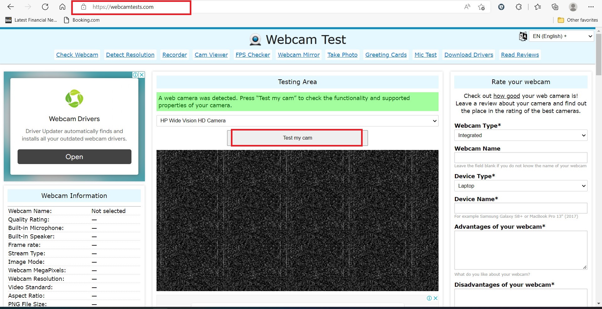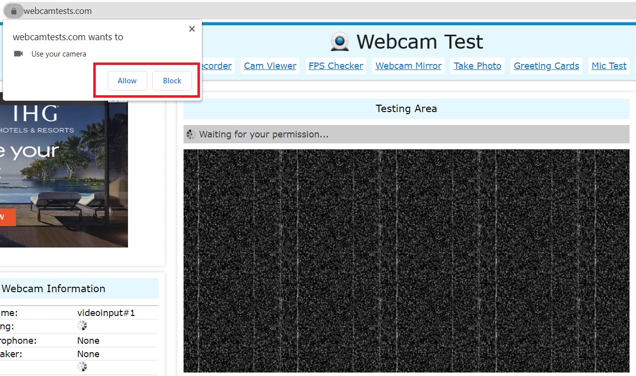 B2: Bấm Test my cam, nếu có cửa sổ xuất hiện, hỏi bạn có cho phép sử dụng camera không?, bạn bấm nút Cho phép (hoặc Allow) và chờ hệ thống kiểm tra thông tin webcam.
