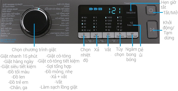 Bạn có thể chủ động cài đặt thời gian để máy giặt tự động hoàn tất việc giặt tại một thời điểm xác định bằng cách hẹn giờ trong khoảng 1 đến 24 tiếng. Giờ hiển thị là thời gian giặt kết thúc.