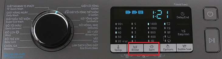 - Nhấn giữ đồng thời "Rinse" và "Spin" trong 3 giây để kích hoạt hoặc tắt chức năng này.