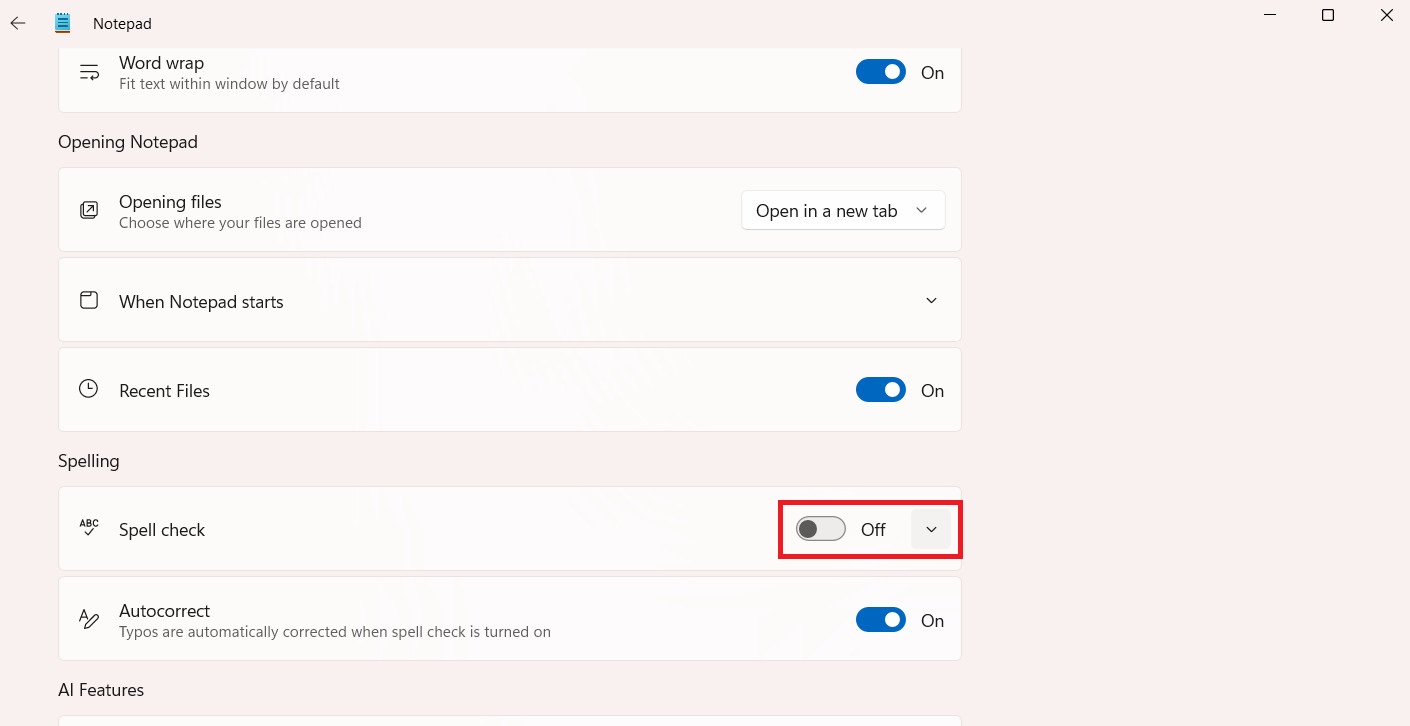 Bước 2: Trong cửa sổ cài cặt ứng dụng Notepad, tìm đến Spell check, chuyển sang chế độ Tắt (Off), vậy là được.