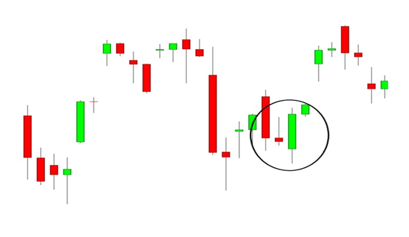 Cây nến thứ hai biểu thị một ngày có áp lực bán lớn vào đầu phiên giao dịch và cố gắng thiết lập một đáy mới. Tuy nhiên, sau đó, những người đầu cơ giá lên đã chiếm ưu thế một cách quyết đoán, đẩy giá vượt qua giá mở cửa của ngày hôm trước trước khi thị trường đóng cửa.