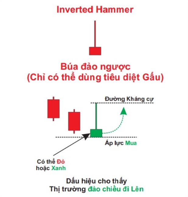 Có dạng tương tự với mô hình nến búa là cùng xuất hiện trong thị trường có xu hướng giảm và dấu hiệu đảo chiều tại đáy. Mô hình nến búa ngược có thân nến nhỏ, thân nến có thể là xanh hoặc đỏ, có bóng nến bên trên dài gấp đôi thân nến và bóng nến bên dưới rất nhỏ hoặc không có