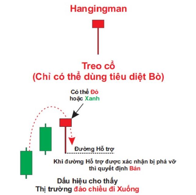 Ý nghĩa: Nến Hanging Man dự báo dấu hiệu đảo chiều giảm giá trong 1 xu hướng tăng trước đó. Tuy nhiên, các nhà đầu tư cần chờ đợi phiên giao dịch tiếp theo kết thúc để ra quyết định trước khi vào lệnh. Dấu hiệu thể hiện thị trường giảm là nến giảm giá mạnh ngay phía sau nến Hanging Man hoặc có một khoảng nhảy giảm giá (gaps down)