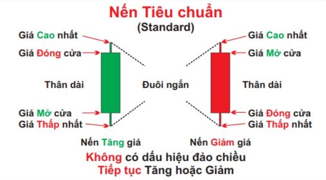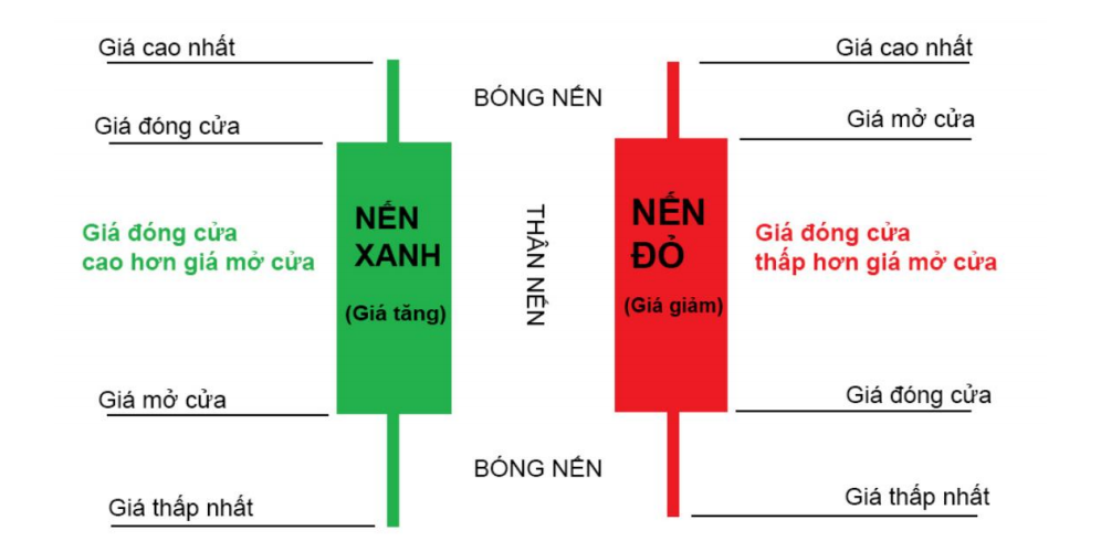 Có thể thấy rằng, một cây nến tiêu chuẩn gồm 2 phần: thân nến và bóng nến. Đối với nến tăng (màu xanh), giá đóng cửa sẽ cao hơn giá mở cửa. Đối với nến giảm (màu đỏ), giá đóng cửa sẽ thấp hơn giá mở cửa.