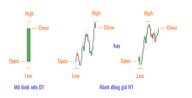 Bên trái là một mô hình nến D1, bên phải là 2 hành động giá trên H1. Bạn có biết được hành động giá nào ở bên trong nến D1 đó không? Hành động giá bên trong bản thân cây nến quan trọng hơn cây nến đó rất nhiều vì nó cho bạn biết nhiều điều về thị trường hơn