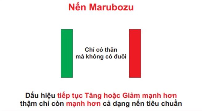 Ý nghĩa: thể hiện lực mua (nến xanh) và lực bán (nến đỏ) rất là mạnh, chính vì vậy nó thường xuất hiện khi thị trường tăng giá hoặc giảm giá mạnh. Điều này cho thấy trong quá trình mua bán và giao dịch các nhà đầu tư không có sự lưỡng lự giữa 2 bên mua bán