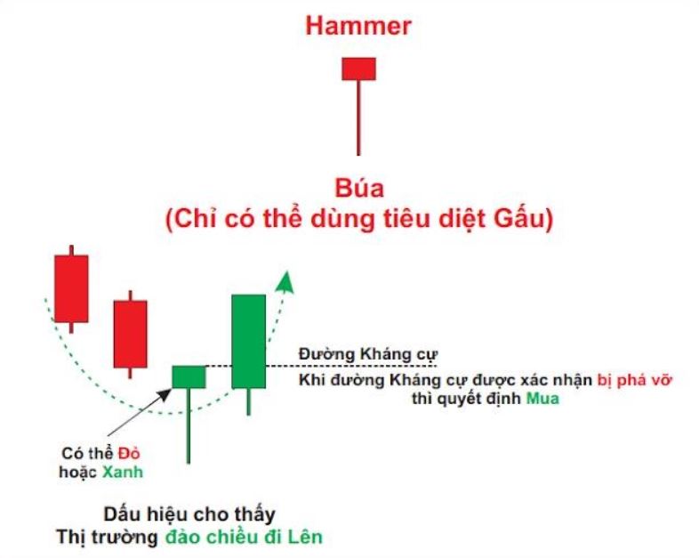 Ý nghĩa: Nến búa hammer thường được xuất hiện trong thị trường có xu hướng giảm báo hiệu dấu hiệu đảo chiều cực kì mạnh, thể hiện tâm lý các nhà đầu tư đang tìm kiếm vùng giá tốt để gia nhập thị trường và hình thành áp lực mua đè lên áp lực bán tạo nên dấu hiệu đảo chiều và tăng giá xuất hiện