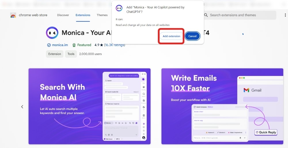 - Bước 4: Trong cửa sổ hiện ra, hãy nhận chọn Thêm tiện ích (Add extension). Sau khi cài đặt xong, bạn hãy tải lại trình duyệt. Biểu tượng Monica AI sẽ xuất hiện ở phía bên phải màn hình trình duyệt. Vậy là bạn đã cài đặt xong, giờ là lúc bắt đầu khám phá trợ lý AI thông minh này nhé!