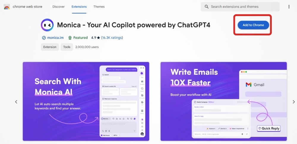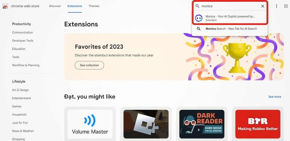- Bước 2: Nhập Monica vào thanh tìm kiếm và chọn tiện ích Monica - Trợ lý trí tuệ nhân tạo của bạn GPT-4.