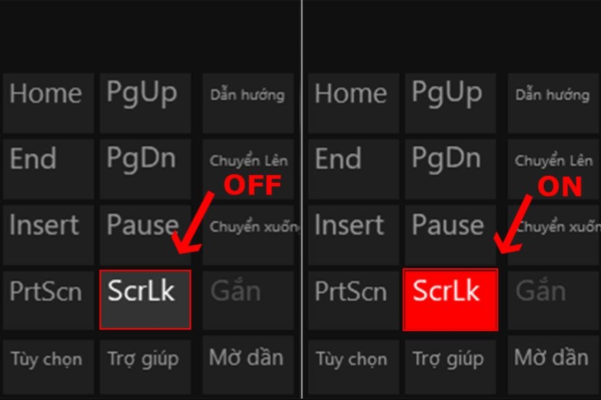 Lúc này bạn nhấp chuột vào phím Scroll Lock (ScrLk), nếu thấy hiện màu đỏ tức là đã bật thành công phím tắt này.